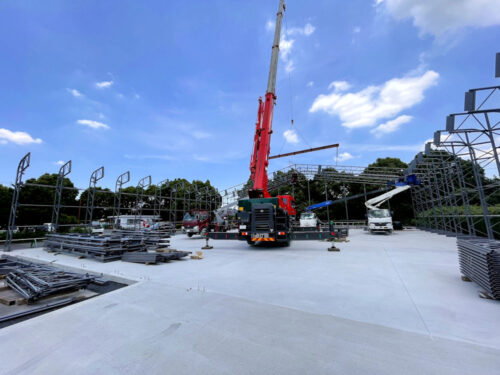 ①シートの一体縫製と搬入屋根や壁となる膜材は、工場で一枚の巨大なシートとして溶着・縫製され、現場に搬入されます。これにより、現場の作業をスピーディーに施工することを可能としています。