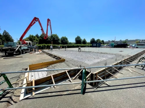 ①コンクリートの打設と均しポンプ車を使い、生コンクリートを型枠の隅々まで行き渡らせます。 流し込み後は、バイブレーターで振動を与え、内部の気泡を取り除き、コンクリートの密度と強度を高めます。養生期間の確保コンクリートが設計通りの強度(圧縮強度)を発現するためには、適切な温度と湿度の管理(養生)が必要です。この期間を確実に確保することで、基礎は長期にわたって沈下やひび割れに対抗できる強靭な体質を獲得します。基礎の種類地盤の状況や倉庫の用途に応じて、柱ごとに独立した基礎、外周を連続した梁で繋ぐ布基礎、床全体を覆うベタ基礎など、最適な基礎形式をとしています。